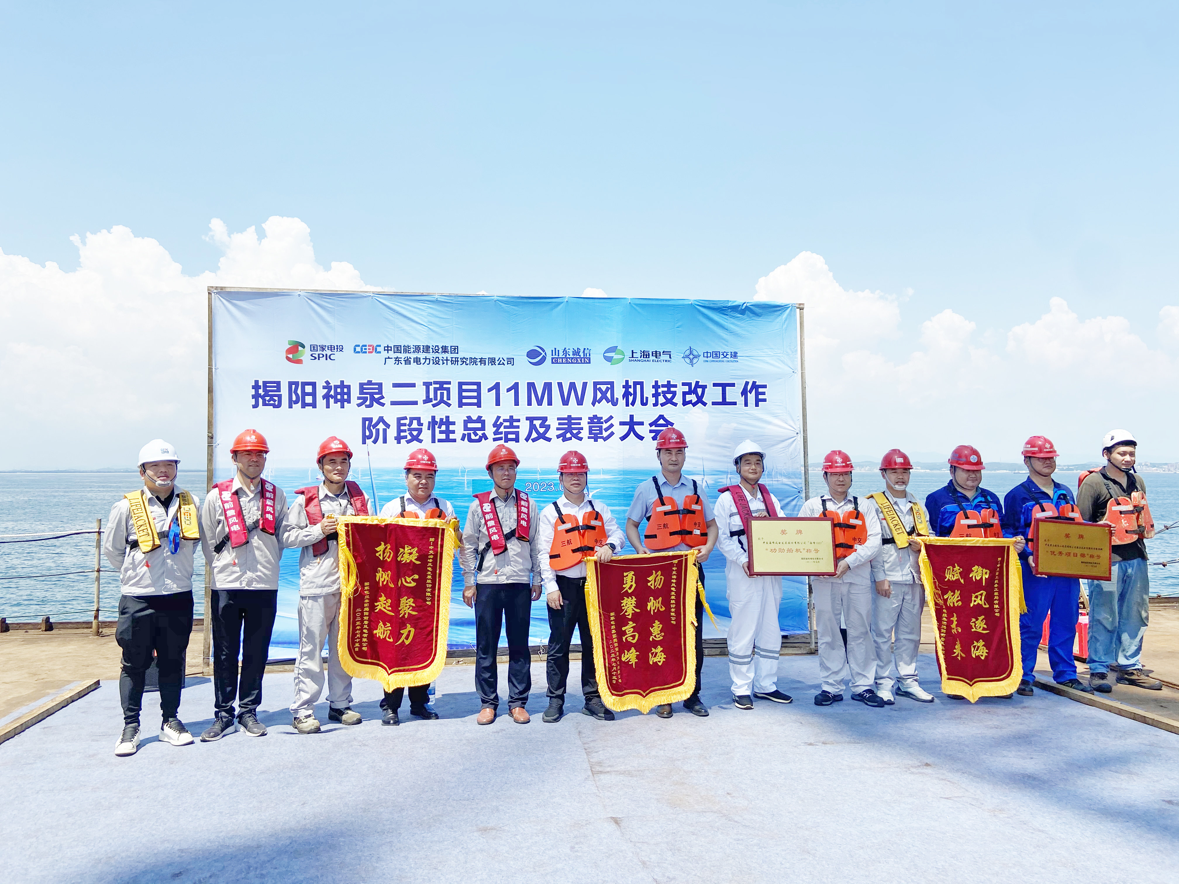 9月21日上午,揭阳神泉二项目11MW风机技改工作阶段性总结及表彰大会在公司“海峰1007”风电安装平台上成功举行。公司“海峰1007”800吨自升式风电安装平台荣获“功勋船机”称号。