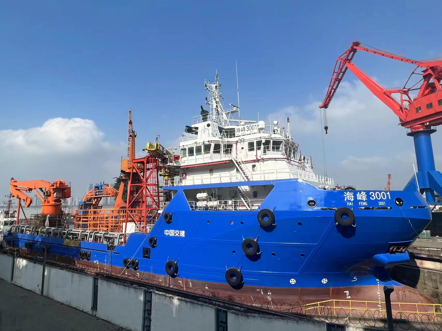 “海峰3001”船长75米,型宽17.25米,型深8米,定员50人,具备DP-2定位能力。此次重大改造设计新增一台进口波浪补偿栈桥、成套300吨电动缆盘及支缆铺设设备和海缆修复专用设备及操作平台,升级一台40吨海工折臂吊机关键设备,完成改造后既能够满足2.5米有义波高海况下海上风场运维作业,也能实现海缆敷设及海缆抢修功能。船舶配置全船信息化管理系统,与公司海上风电智慧运维系统平台实时联动,实现海上风电多功能运维母船运营功能。
