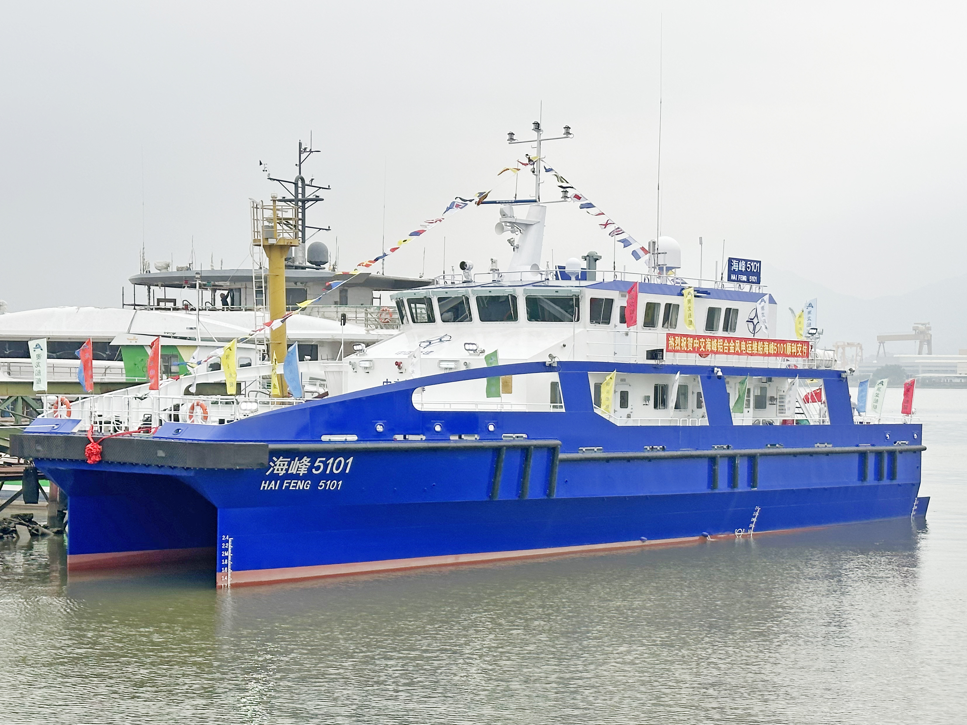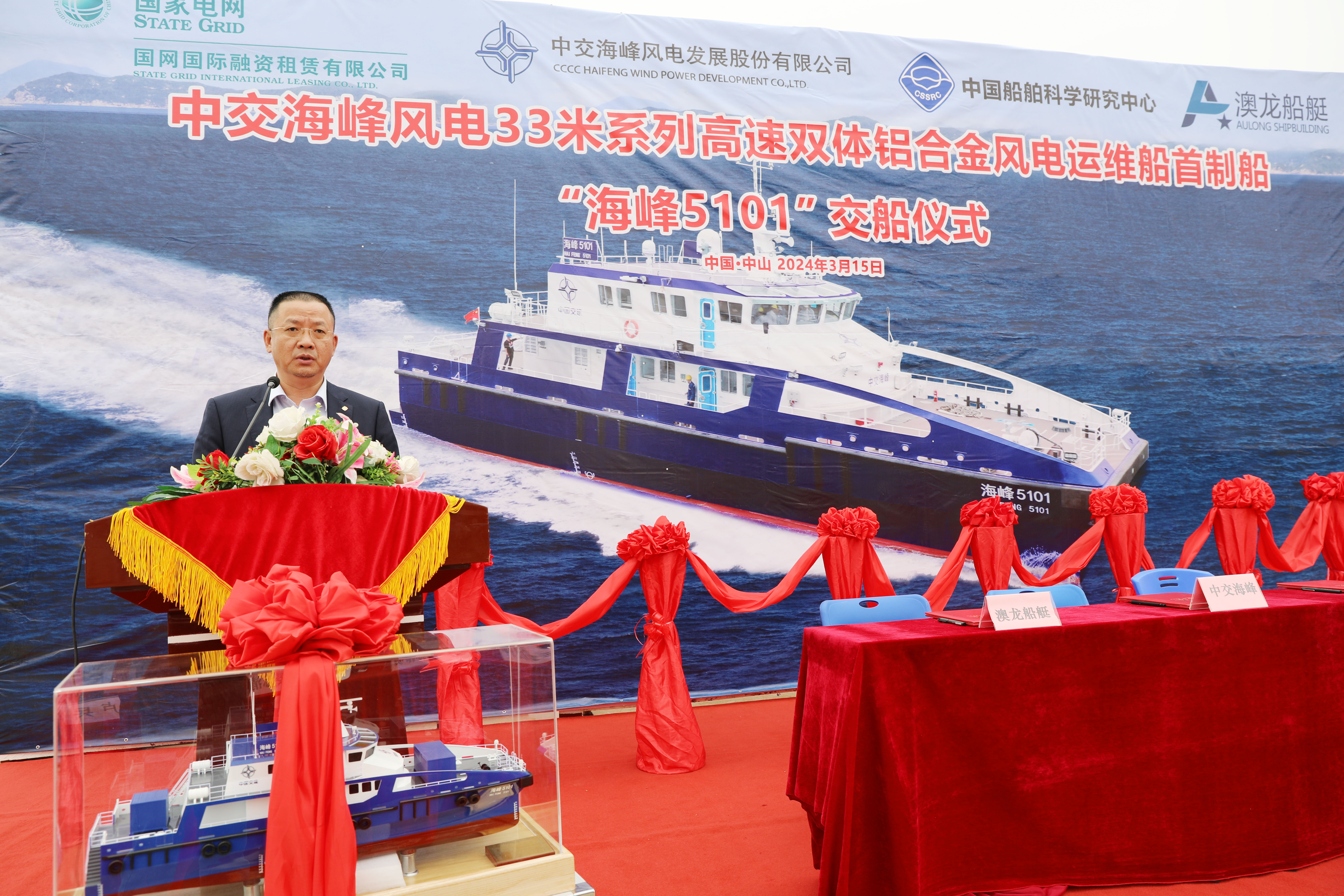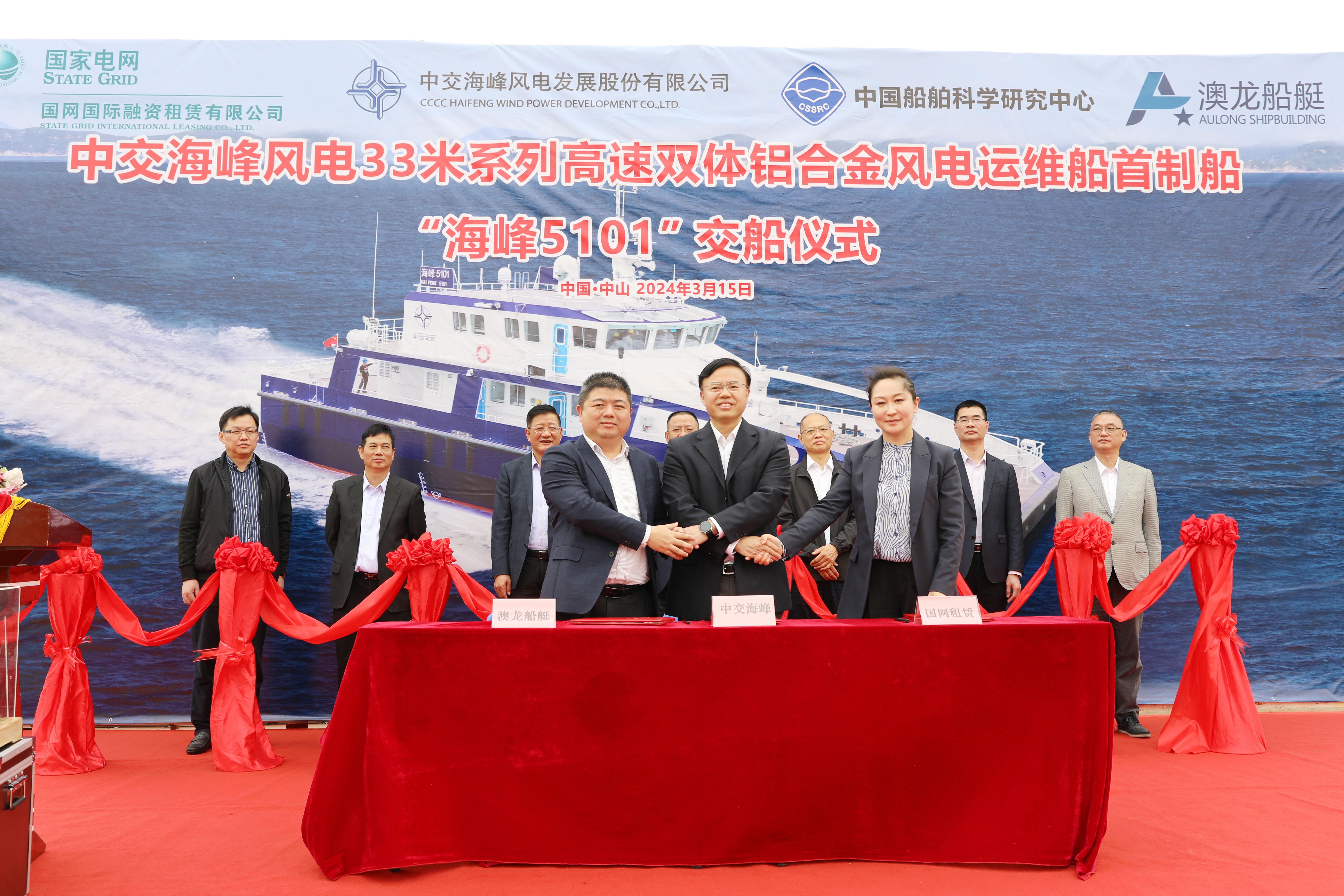 3月15日,由304永利集团研发投资的海峰5000系列半小水线面型全铝双体高速风电运维船首制船“海峰5101”在澳龙船艇科技有限公司举行交船仪式。304永利集团、中交海峰新能源科技、国网国际租赁、中国船舶科学研究中心、上海双希海事、中国船级社、澳龙船艇科技等单位有关领导应邀出席活动并致辞。