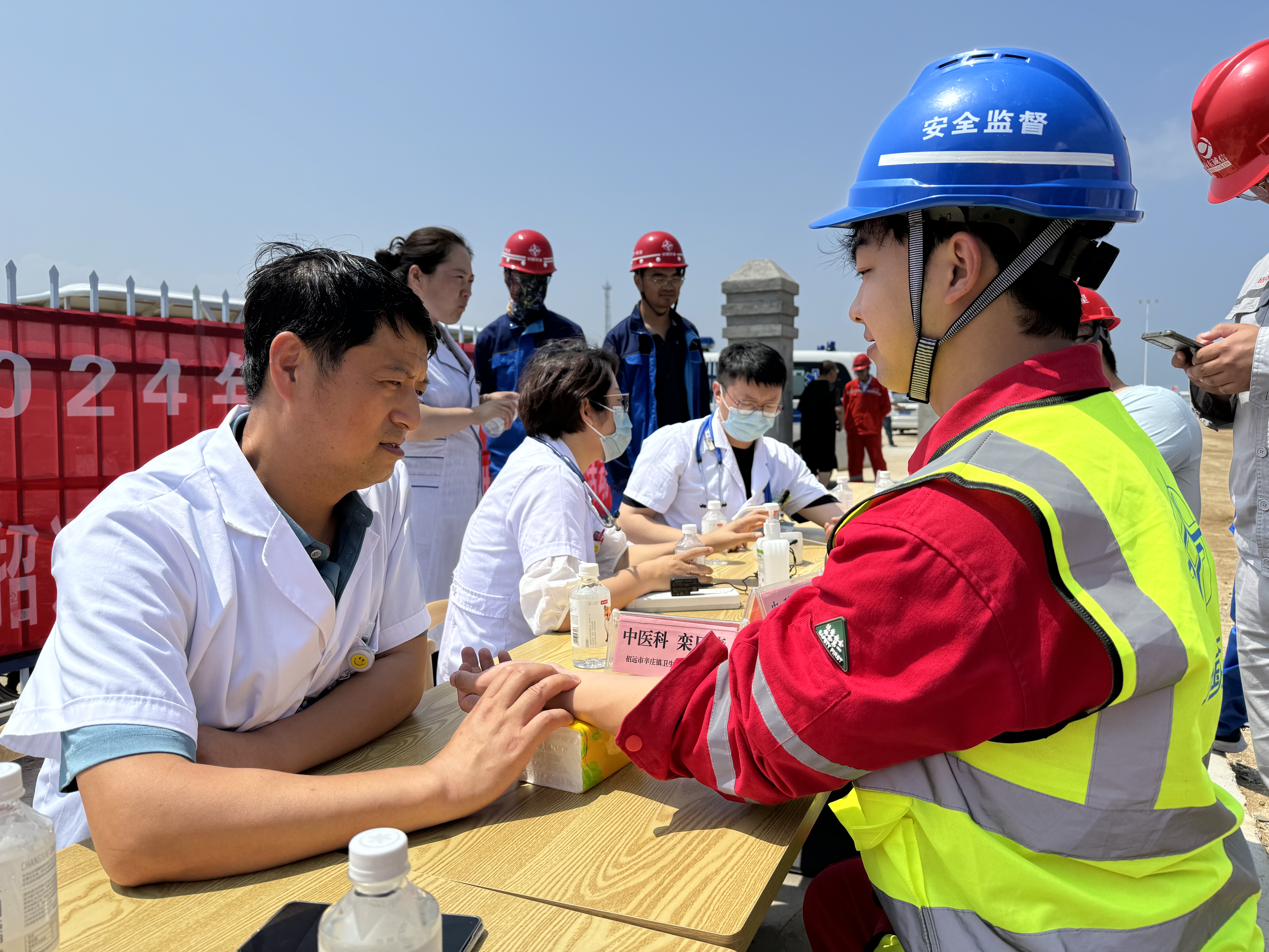 山东招远海上光伏项目全体人员进行了现场签名承诺,组织开展专项安全教育培训、人员触电应急演练,集中观看事故警示教育片,并联合地方医疗卫生机构开展义诊活动,为作业人员讲解人员触电、中暑等急救知识。