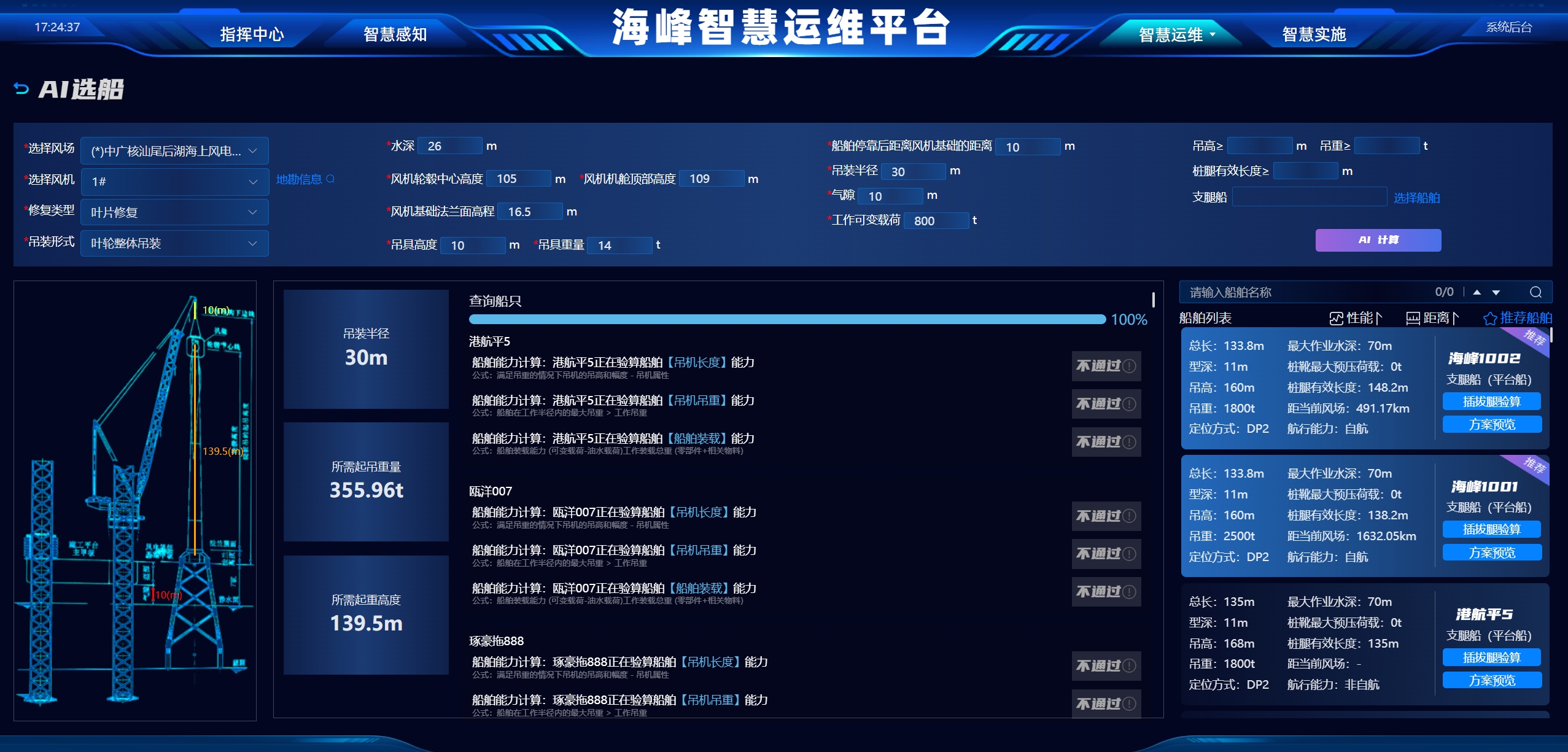 海上运维不可避免会涉及到选择合适船舶作业的问题,选船前需要进行插拔可行性验算、吊高能力验证、吊重能力验证等,计算过程复杂。为了提高决策效率,开发了AI选船模块,通过分析比对不同工况、船舶性能等参数,自动推荐合适的作业船舶,并生成相应的承载力与拔桩力曲线,同时提供船舶距离、性能等作为经济性的参考依据,辅助业务人员进行决策。