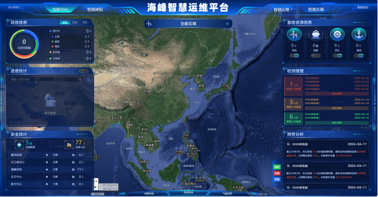通过拟合不同气象数据源的高精度气象数据,实现任意风场区域、任意风机湿度、风速、风向、波高、波周期、波向、湿度、能见度等气象信息的7日内小时级预报,可以实现不同业务的窗口期预测,及时掌握灾害天气趋势,统筹规划运维作业。